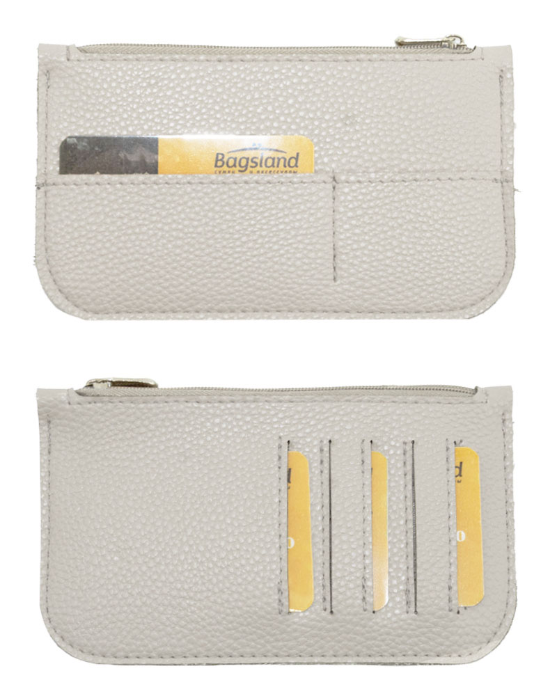 Внутри имеет два отдела разделенные перегородкой с карманами для карт. По внешней стороне два кармана для карт.
